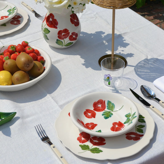 Een royaal handgeschilderd bord dat stijl en vrolijkheid naar elke tafel brengt. Gebruik het als opvallende serveerschaal voor antipasti, gebak of kazen, of als sierlijk onderbord voor een feestelijk diner. Ook perfect als origineel geschenk dat zeker in de smaak zal vallen.